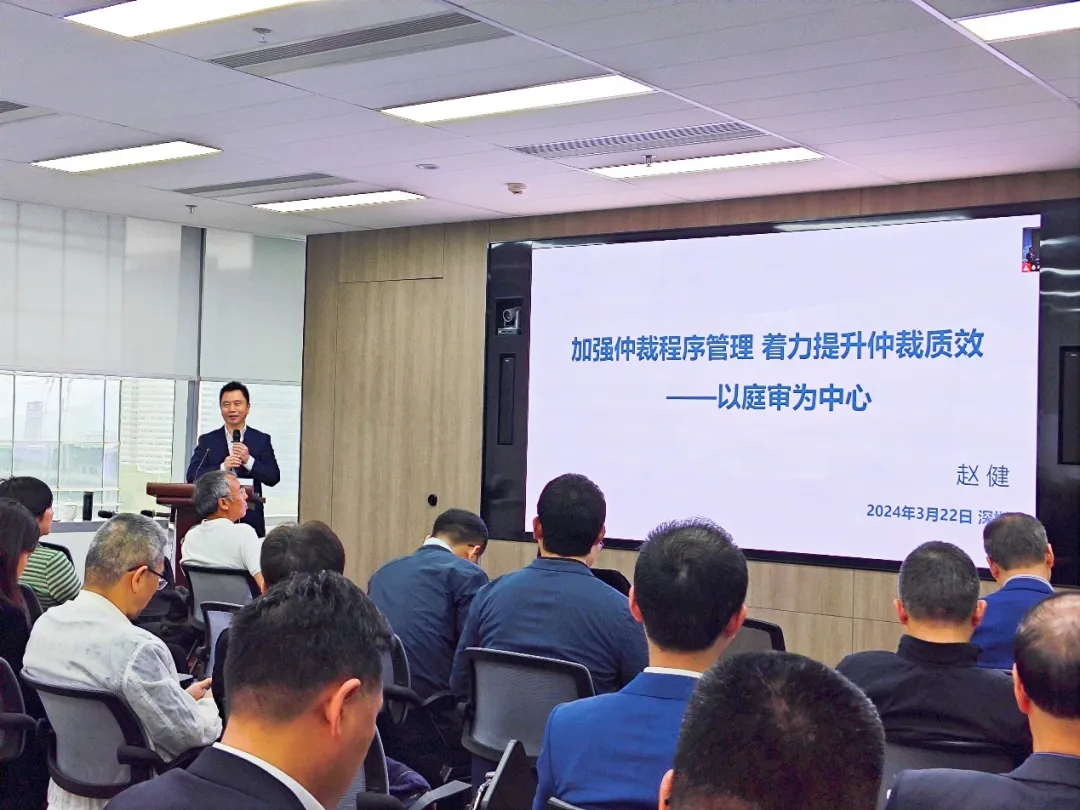 2024年3月22日,2024年第三期大湾区仲裁员交流与培训系列活动在深圳举办。本次培训活动由中国国际经济贸易仲裁委员会(以下简称“贸仲”)华南分会举办,北京市中伦律师事务所高级顾问、贸仲仲裁员、原贸仲仲裁院副院长、中国国际私法学会副会长赵健仲裁员以“加强程序管理,提高仲裁质效——以庭审为中心”进行了主题分享。本次培训活动由贸仲华南分会秘书长李云主持。